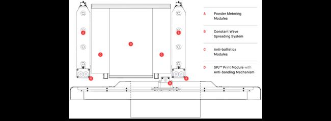 C. 防彈射模塊[SB2]在打印過程中處理新壓實的粉末床以控制顆粒。噴墨打印頭的墨滴以每秒8米的速度排出。當它們撞擊粉床時,部分動能會轉移到粉床內的顆粒上。如果不加控制,顆粒會飛回噴墨打印頭,隨著時間的推移,會堵塞噴嘴。防彈技術消除了這種噴射物,大大提高了噴射可靠性。