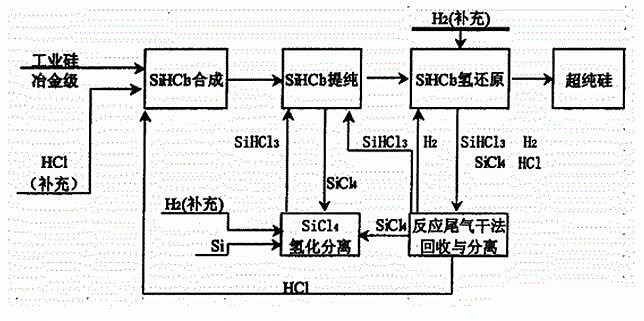 1955年,西門子公司成功開發了利用氫氣還原三氯硅烷(SiHCl3)在硅芯發熱體上沉積的工藝技術,并于1957年開始了工業規模的生產,這就是通常所說的西門子法。在西門子法工藝的基礎上,通過增加還原尾氣干法回收系統、SiCl4氫化工藝,實現了閉路循環,于是形成了改良西門子法——閉環式SiHCl3氫還原法。