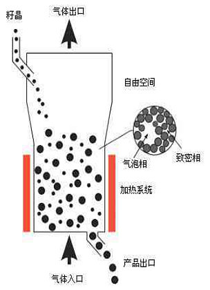 顆粒硅流化床法生產工藝是把細小的硅顆粒種子鋪在有氣孔的床層上,從下面通入氣態硅化合物(硅烷或三氯氫硅)和其它反應氣,氣流把硅種吹到飄浮半漂浮的流化狀態,加熱和受到催化的硅化合物氣體分解或與其它氣體反應,生成的硅單質沉積在浮動的硅種上,慢慢長成較大的硅粒,幾毫米到厘米級別都有,大點的顆粒掉入搜集斗,再由出料管送出流化床反應器。(流化床反應器結構圖如下)