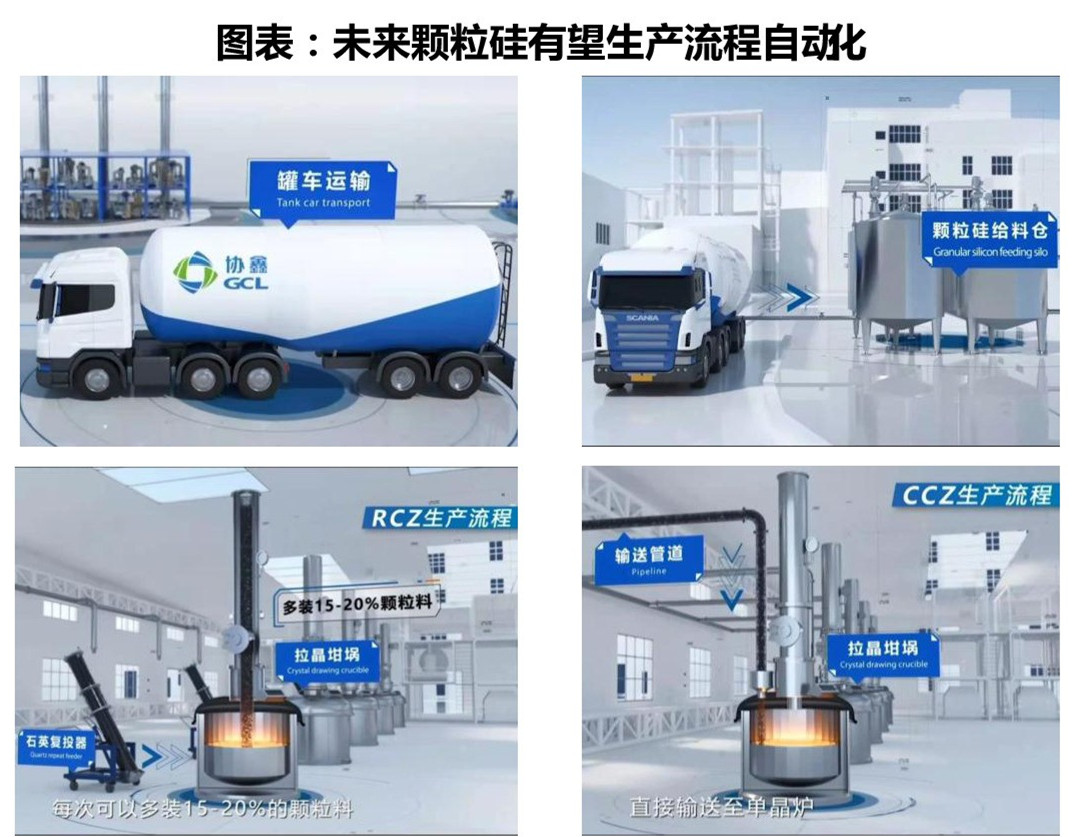 顆粒硅無需破碎環節,更利于生產過程自動化,可通過飲水機模式減少包裝與人工環節,實現加料自動化(FBR工廠—罐車運輸—除塵儲存—AGV裝運—裝料);同時可通過側加料模式,減少等待時間3.6h,提升效率。