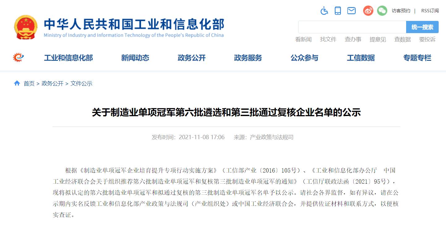 一、制造業單項冠軍示范企業(第六批)