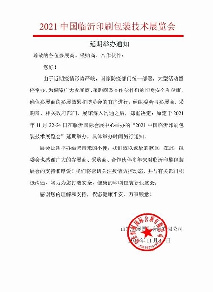 重要通知:臨沂印刷包裝技術展覽會剛剛接到臨沂市政府會展辦通知:因為疫情影響,展會延期舉辦。請大家互相轉告!!!具體時間另行通知。