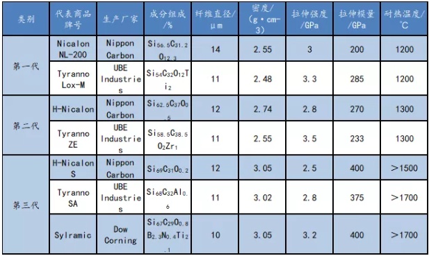隨著碳化硅纖維制備工藝的改善,目前已經形成了三代產品。第一代碳化硅纖維是以日本碳公司生產的Nicalon 200和Tyranno LOX-M為代表,由于在其制備過程中引入了氧,纖維中的氧質量分數為10%~15%,在高溫下碳化硅纖維的穩定性變差,影響了纖維在高溫環境下的強度和彈性模量。為改善該問題研制了第二代碳化硅纖維,以日本碳公司的Hi-Nicalon與宇部興產公司的Tyranno LOX-E、Tyranno ZM和Tyranno ZE為代表,通過在無氧氣氛中采用電子輻照對原纖維進行不熔化處理來降低碳化硅纖維中的氧含量,從而保障其在高溫環境下的穩定性。為滿足航空和軍工領域對高溫材料性能的更高要求,日本和美國分別開發了第三代碳化硅纖維,以日本碳公司的Hi-Nicalon S、宇部興產公司的Tyranno SA以及美國道康寧公司的Sylramic纖維為代表,第三代碳化硅纖維中的雜質氧、游離碳含量進一步降低,接近碳化硅的化學計量比。