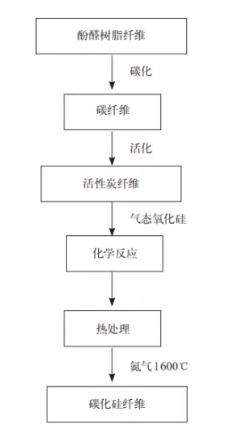 活性炭纖維轉化法主要包括三大工藝環節,首先是制備活性炭纖維,可以采用酚醛基、瀝青基等有機纖維,經過200~400℃在空氣中進行幾十分鐘至幾小時的不熔化處理,隨后進行碳化和活化處理制得活性炭纖維;然后,硅和二氧化硅在高溫下反應生成氣態的氧化硅,從而在一定真空度的條件下,控制溫度在 1200 ~1300℃,使活性炭纖維與氧化硅發生化學反應,轉化為碳化硅纖維;最后,控制溫度在 1600℃左右,在惰性氣體氮氣的環境下進行熱處理。