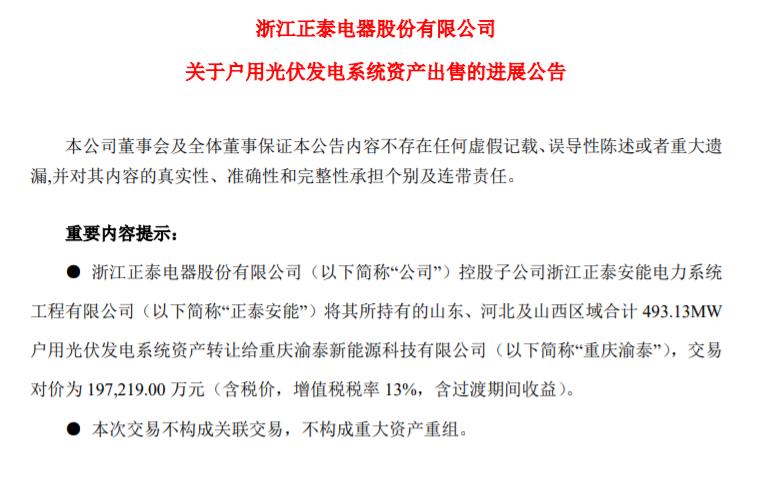 中國粉體網訊 11月15日,正泰電器公告稱,公司控股子公司浙江正泰安能電力系統工程有限公司 (簡稱 “正泰安能”) 將其所持有的山東、河北及山西區域合計493.13MW戶用光伏發電系統資產轉讓給重慶渝泰新能源科技有限公司 (簡稱“重慶渝泰”) ,交易對價為19.72億元。