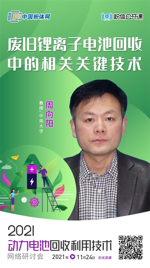 為破解廢舊動力鋰電池回收難題,中國粉體網旗下粉體公開課平臺將于2021年11月24日舉辦“2021動力電池回收利用技術網絡研討會”,屆時來自中南大學的周向陽教授將作《廢舊鋰離子電池回收中的相關關鍵技術》報告,報告人將主要針對廢舊鋰離子電池回收中的相關問題進行闡述,主要內容:(1)廢舊電池回收的意義;(2)廢舊電池現行處理工藝及其存在的問題;(3)提出一種集帶電破碎、優先提鋰與分離碳負極以及鎳鈷選擇性浸出等工序于一體的廢舊三元電池處置工藝;(4)提出一種廢舊磷酸鐵鋰電池全資源回收的方案;(5)針對現行廢舊電池處置工藝中存在的高COD與含氟廢水問題,提供了相應的解決思路;(6)回收負極粉的應用領域簡述。