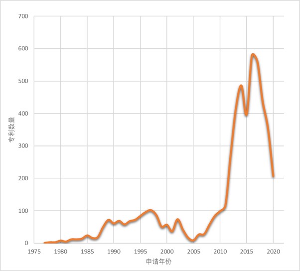 圖1:世界鈉離子電池專利申請數(shù)量趨勢(截至2021年前)