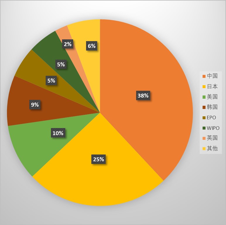申請來源國排名前三位的是中國、日本和美國。這反映出這些國家在該技術(shù)領(lǐng)域的技術(shù)實(shí)力狀況領(lǐng)先。其中,中國的專利申請量占比最大,占到了中英文專利總數(shù)的38%?梢钥闯鲋袊髽I(yè)和研究機(jī)構(gòu)對鈉離子電池的研究十分重視。