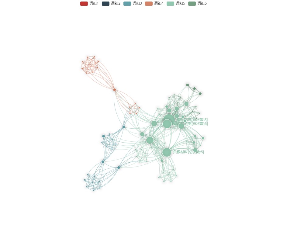 由于關(guān)鍵詞之間聯(lián)系緊密,共現(xiàn)網(wǎng)絡(luò)圖排布較為密集。出現(xiàn)最多的前幾大關(guān)鍵詞為:容量保持率、倍率性能、正極活性材料、普魯士藍(lán)、放電容量、放電比容量、初始容量和壓實(shí)密度。可以看出寧德時(shí)代鈉離子電池具體研究的重心在于正極材料的普魯士藍(lán)類材料。