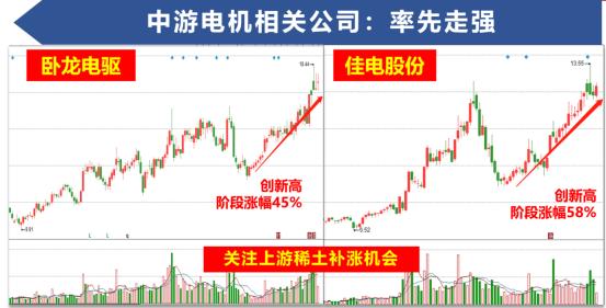 從稀土永磁電機產業鏈來看,近期市場資金主要集中在中游電機制造公司,如臥龍電驅、佳電股份近期股價都創出新高,階段漲幅分別達到45%和58%。
