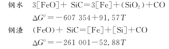 SiC可以作為爐外精煉脫氧劑。精煉爐脫氧和電爐還原期脫氧都屬于擴(kuò)散脫氧,根據(jù)分配定律:在一定的溫度下,氧在熔渣中與鋼水中的溶解度是平衡的,F(xiàn)eO在渣與鋼液中的質(zhì)量分?jǐn)?shù)比是個(gè)常數(shù)。當(dāng)SiC加入到渣層表面時(shí),渣中的FeO含量降低,平衡被破壞,為了保持在此溫度下的分配常數(shù),鋼中氧必向渣中擴(kuò)散,從而降低了鋼中的氧含量,達(dá)到鋼液脫氧的目的。