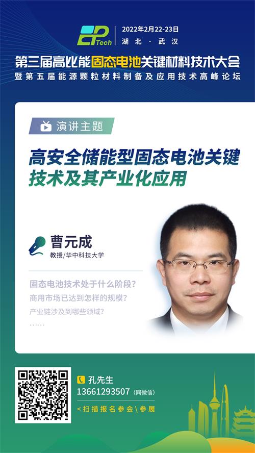 隨著技術的不斷成熟,固態鋰電池在高安全儲能領域有望獲得快速發展。2022年2月22-23日,由中國粉體網主辦的“第三屆高比能固態電池關鍵材料技術大會”將于湖北武漢東方建國大酒店舉辦,屆時將邀請來自華中科技大學的曹元成教授作《高安全儲能型固態電池關鍵技術及其產業化應用》報告。報告人將介紹其團隊依托武漢新能源研究院和華中科技大學的平臺,主要針對智能電網對本征安全先進儲能技術的廣泛需求,開展高安全、高比能、長壽命固態電池關鍵材料的研發及產業化應用,開發出一系列聚合物基復合型固態鋰電池,并且從關鍵材料制備、電芯組裝工藝、儲能模組集成等方面,初步實現了高安全儲能型固態鋰電池產業化應用的突破,并定型了面向家用小型儲能和工業儲能的儲能系統產品,實現了從基礎研究到固態電池樣機驗證及儲能系統示范的全鏈條一體化設計與應用。