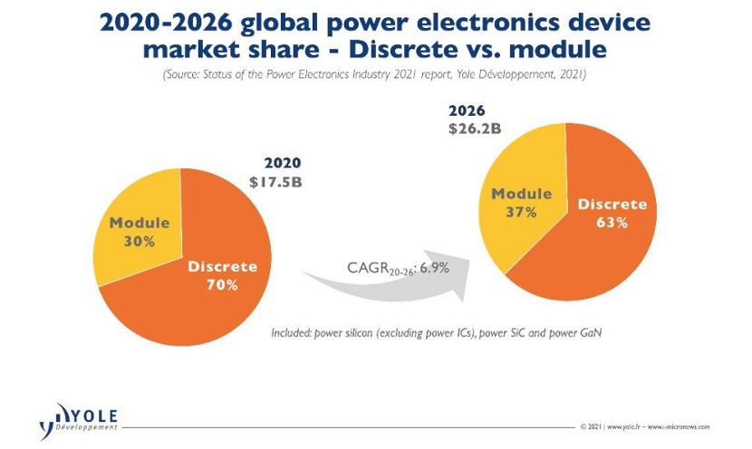 Yole指出,當前功率器件市場仍由分立器件主導,但未來幾年功率模塊份額將顯著增加。汽車、工業電機驅動器和電信將成為分立組件細分市場的主要驅動力,到 2026 年分立組件細分市場將超過 160 億美元。電動汽車、工業電機和家用電器將到 2026 年,將功率模塊市場推向近 100 億美元。