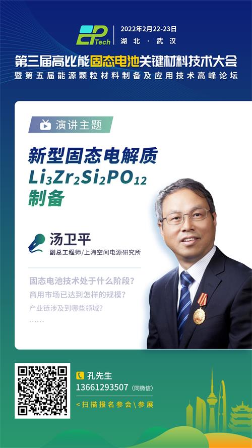 為深入了解NASICON型固態電解質,2022年2月22-23日,由中國粉體網主辦的“第三屆高比能固態電池關鍵材料技術大會”將于湖北武漢東方建國大酒店舉辦,屆時將邀請來自上?臻g電源研究所的湯衛平研究員作《新型固態電解質Li3Zr2Si2PO12制備》報告。本報告主講人匯報利用Na+/Li+離子交換方法成功地把Na3Zr2Si2PO12轉化為Li3Zr2Si2PO12,形成了一類新型的鋰離子固態電解質。分析結果表明交換前后的結晶結構沒有發生變化,Na+和Li+離子的占位和傳輸路徑完全不同。Li3Zr2Si2PO12固態電解質的離子電導率達到3.6x10-3S/cm,物理化學、電化學穩定性優異。