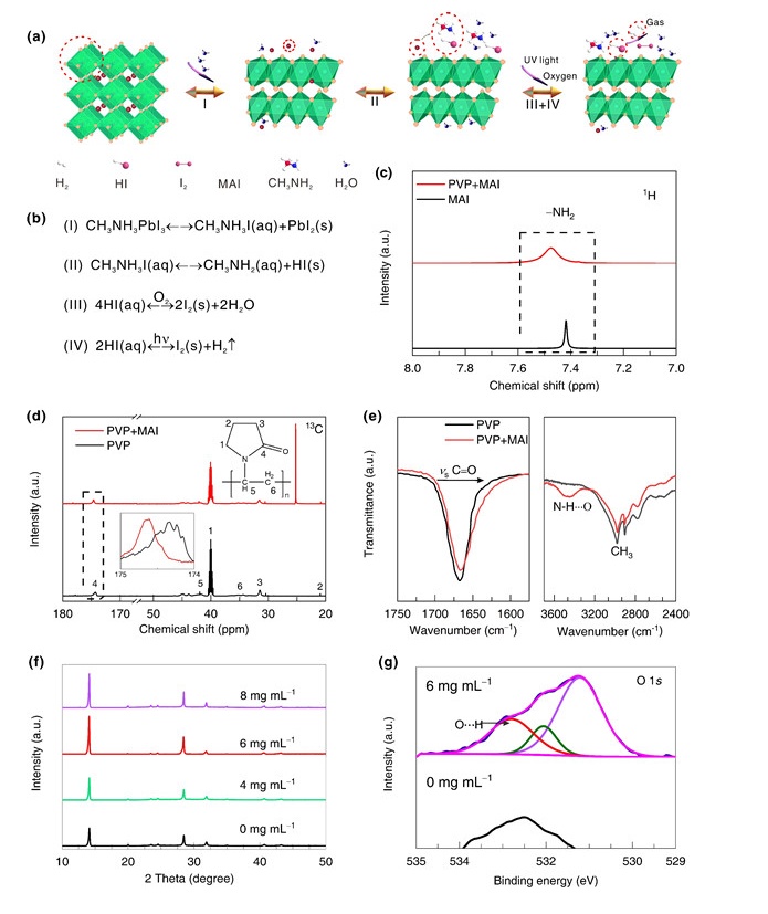圖1. (a)和(b) 鈣鈦礦材料在水分子存在下的降解途徑;MAI和含有聚乙烯吡咯烷酮的MAI在DMSO-d6溶液中的1H NMR譜圖(c)和13C NMR譜圖(d);(e) 聚乙烯吡咯烷酮與MAI摩爾比為1:1混合制備的MAI、聚乙烯吡咯烷酮的FTIR光譜,箭頭為C=O和CH3的伸縮振動峰;(f) 不同濃度聚乙烯吡咯烷酮溶液下鈣鈦礦膜的XRD譜圖;(g) 含有和沒有聚乙烯吡咯烷酮的O 1s在200小時后的XPS圖。