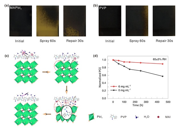 圖2. 含有(a)和不含(b) 聚乙烯吡咯烷酮的薄膜,顯示了水蒸氣噴涂60秒后,自修復30秒后的狀態變化;(c) 鈣鈦礦薄膜自修復過程示意圖;(d) 含有6 mg mL-1聚乙烯吡咯烷酮的鈣鈦礦太陽能電池在65±5%相對濕度下的濕度穩定性。