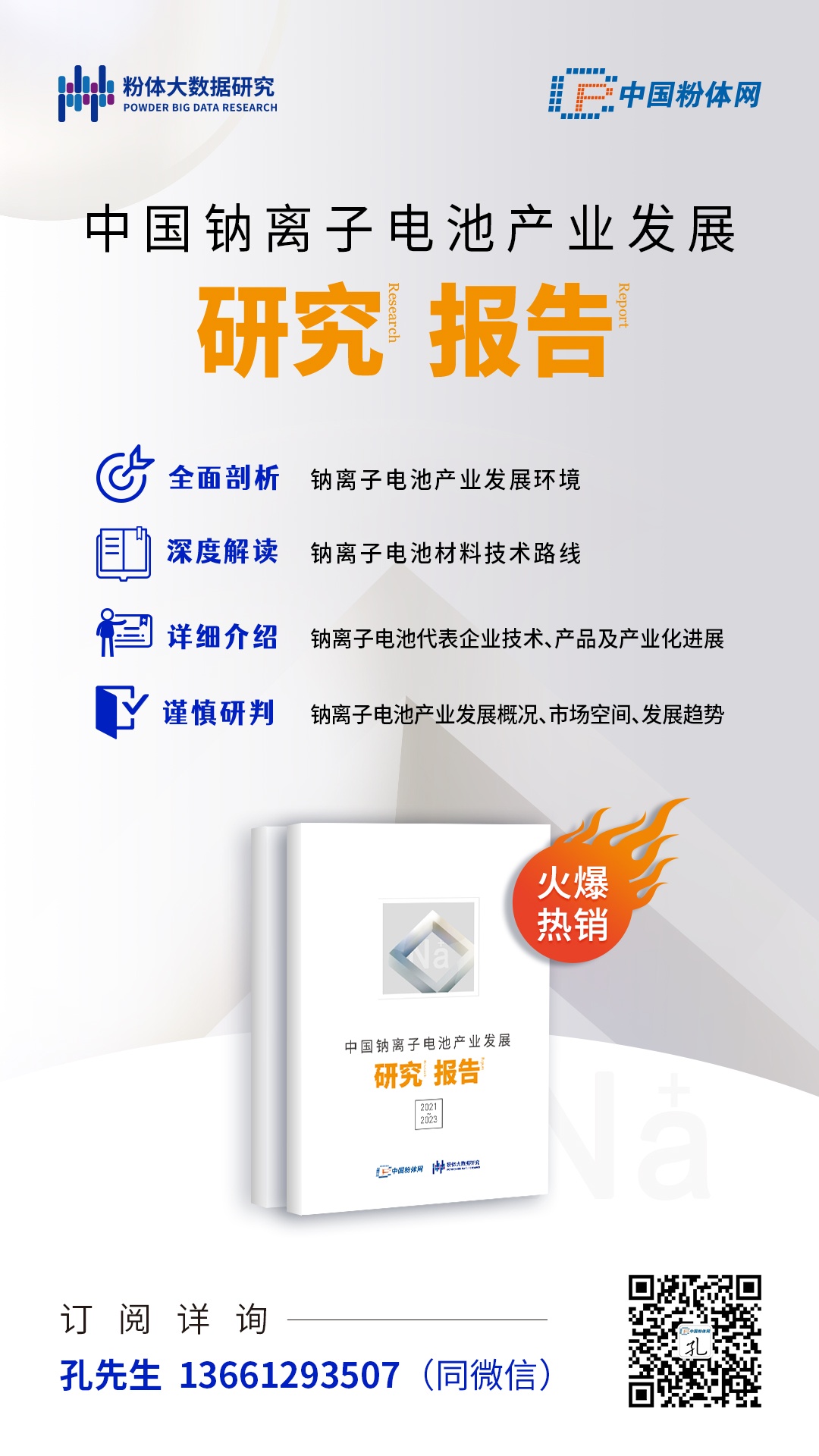 為幫助企業全面系統了解新興的鈉離子電池技術與產業發展現狀,發現市場投資機會,把握產業未來發展趨勢,粉體大數據研究通過對全國主要鈉離子電池研發企業、鈉電鋰電材料企業進行調查,結合鈉離子電池行業領軍人物的演講及院士專家的觀點,收集大量的產業數據、權威報道和技術文獻資料等,推出《中國鈉 離子電池產業發展研究報告(2021-2023)》。