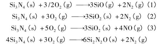 氮化硅在主動氧化機制下發生的反應主要是(1)式,在被動氧化機制下發生的反應主要是(2)式,部分研究人員在試驗中發現被動氧化機制中同時可能有反應(3)式發生。此外,在SiO2和Si3N4的界面處有可能發生反應式(4)。