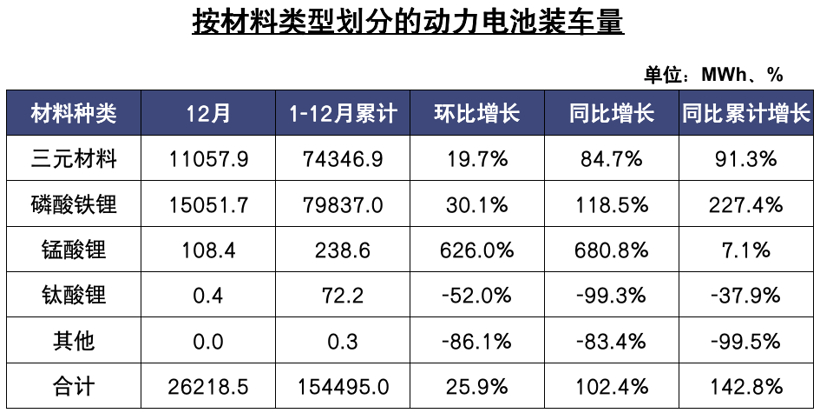 2021年1-12月,我國動力電池產(chǎn)量累計219.7GWh,同比累計增長163.4%。其中,三元電池產(chǎn)量累計93.9GWh,占總產(chǎn)量42.7%,同比累計增長93.6%;磷酸鐵鋰電池產(chǎn)量累計125.4GWh,占總產(chǎn)量57.1%,同比累計增長262.9%。12月份我國動力電池的裝車量為26.2GWh,同比增長102.4%,環(huán)比增長25.9%。其中三元電池共計裝車11.1GWh,同比增長84.7%,環(huán)比增長19.7%;磷酸鐵鋰電池共計裝車15.1GWh,同比增長118.5%,環(huán)比增長30.1%。根據(jù)統(tǒng)計,去年前12月,我國動力電池裝車量累計154.5GWh,同比累計增長142.8%。其中三元電池裝車量累計74.3GWh,占總裝車量48.1%,同比累計增長91.3%;磷酸鐵鋰電池裝車量累計79.8GWh,占總裝車量51.7%,同比累計增長227.4%。
