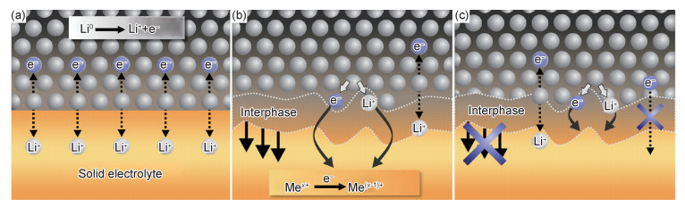 圖2 (a)非反應(yīng)和熱力學(xué)穩(wěn)定界面;(b)反應(yīng)和混合導(dǎo)電界面(MCI);(c)反應(yīng)和亞穩(wěn)固態(tài)電解質(zhì)界面(SEI)(來源:朱曉琪等.鋰金屬電池中復(fù)合固態(tài)電解質(zhì)與負(fù)極界面的研究進(jìn)展)