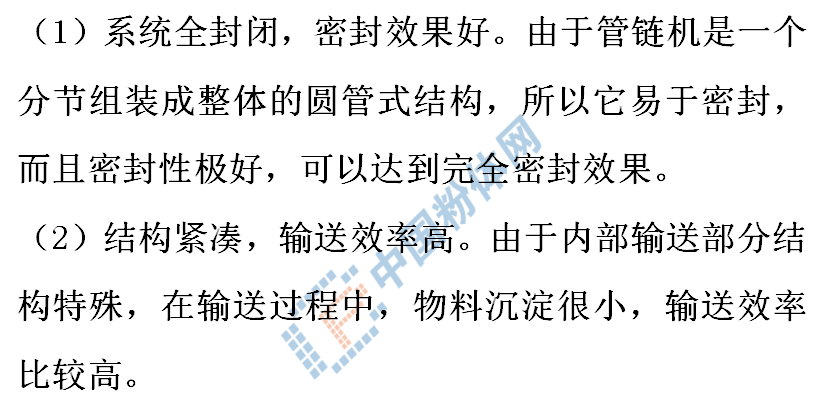 (2)近年來,管鏈輸送機在PTA等行業應用比較成熟,目前在類似的流量小、流動性好的粉粒體輸送中應用較多。管鏈輸送機內部設置有鏈條、輸送盤及轉角鏈輪等機構,近年來涌現出不少針對輸送盤、鏈條、張緊裝置等的研究成果,解決了管鏈輸送機制造和使用中的部分問題,有利于管鏈輸送機的推廣使用。