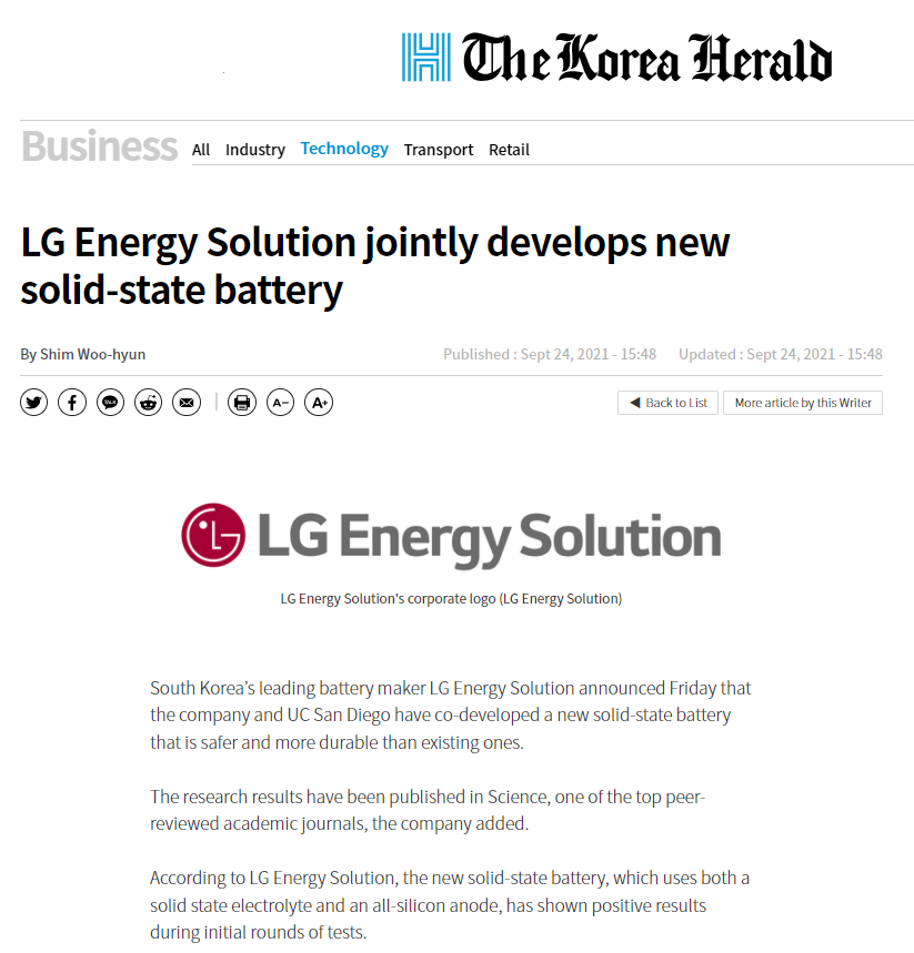 中國粉體網訊 2021年9月24日,韓媒報道,LG Energy Solution(LGES)和加州大學圣地亞哥分校(UCSD)的研究人員合作開發了一種新型全固態硅電池,該電池既采用了固態電解質,又使用了純硅陽極。