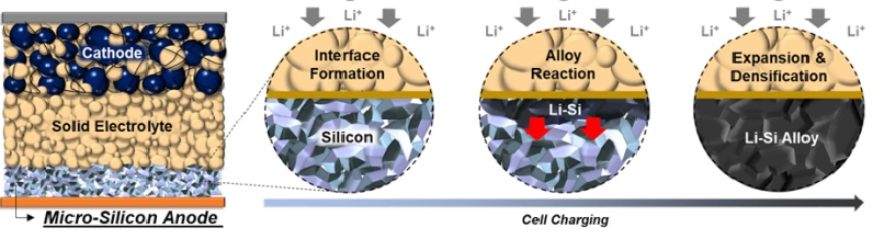 具有高能量密度的下一代固態電池一直依賴金屬鋰作為陽極。但這對電池充電速率和充電過程中需要升高溫度(通常是60攝氏度或更高)帶來了限制。硅陽極克服了這些限制,在室溫到低溫下允許更快的充電速率,同時保持高能量密度,比當今商業鋰離子電池中最常用的石墨陽極高10倍。然而,研究人員表示,硅陽極最大的問題之一是液體電解質界面的不穩定性,這使全硅陽極無法用于商用鋰離子電池。