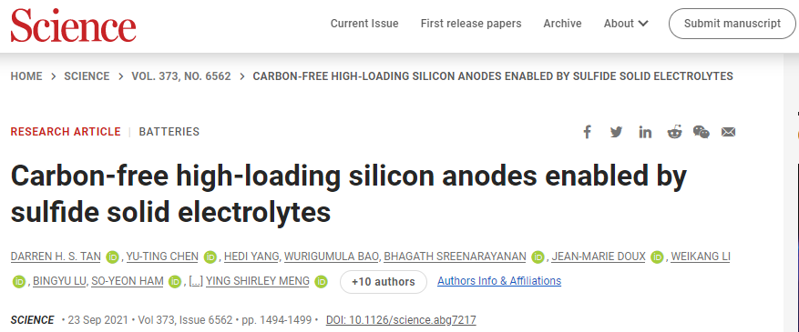 為進一步提高硫化物全固態電池的能量密度,促進其應用,硅負極材料具有極佳的應用前景。綜合利用硅負極和硫化物固態電解質的優點,將硅負極應用于硫化物全固態電池,可以在一定程度上抑制硅負極的缺點,并進一步發揚兩種材料體系的優勢,對實現高能量密度硫化物全固態電池有巨大的推動作用。比如: