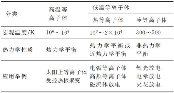 根據(jù)等離子體中電子溫度的不同,可將等離子體分為高溫等離子體和低溫等離子體。而根據(jù)低溫等離子體熱力學平衡狀態(tài)的不同,又可將其分為熱等離子體和冷等離子體。