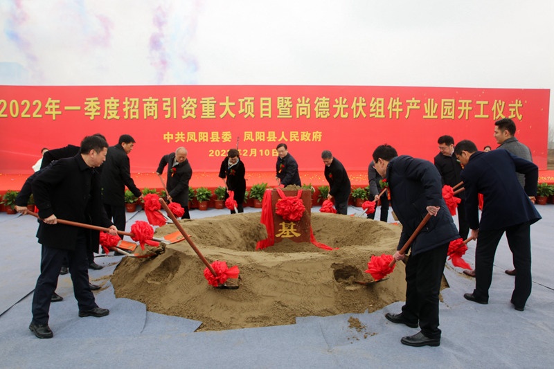 儀式由縣委常委、副縣長程洪全主持。市委副書記、市長吳勁宣布鳳陽尚德光伏組件產業園等招商引資重大項目集中開工。縣委副書記、縣長王俊卿在致辭中指出,2022年一季度招商引資重大項目暨尚德光伏組件產業園開工,是鳳陽縣“沖刺全省前十、打造千億硅谷”的喜事、大事。