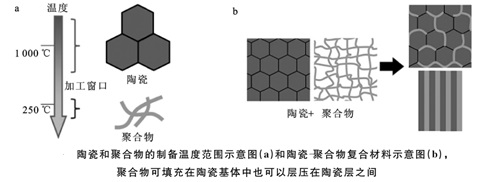 由于許多無機材料的熔點較高,故其傳統熱燒結的燒結溫度也較高,而高分子材料在高溫下不穩定,導致陶瓷和有機物的共燒之間存在著天然的鴻溝。冷燒結工藝由于其極低的燒結溫度,使陶瓷-有機物的共燒成為可能,如下圖所示。