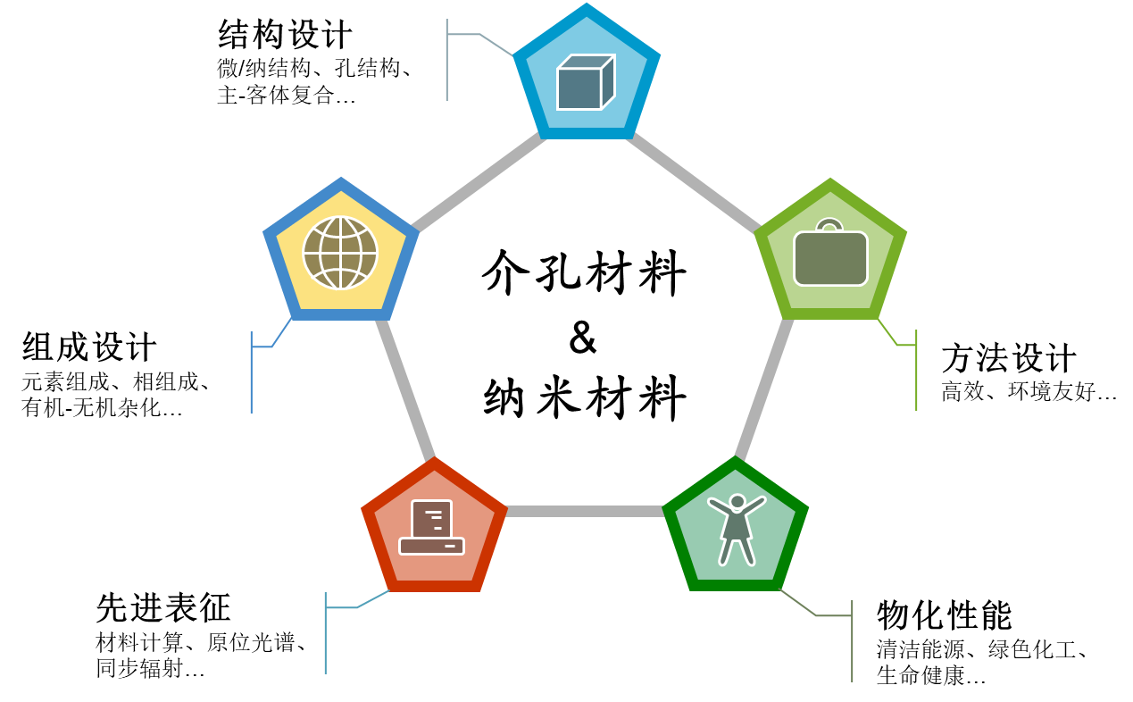 聚焦介孔與其他無機納米材料研究中的關鍵科學技術問題(如可調控的微孔-介孔-大孔結構、納米材料高效綠色合成、主-客體復合材料的組裝合成),通過材料組成、微結構與合成方法的設計創新,結合材料計算科學、原位光譜、同步輻射等先進表征,開展新型介孔(基)與其他無機納米材料的制備科學及物化性能研究。