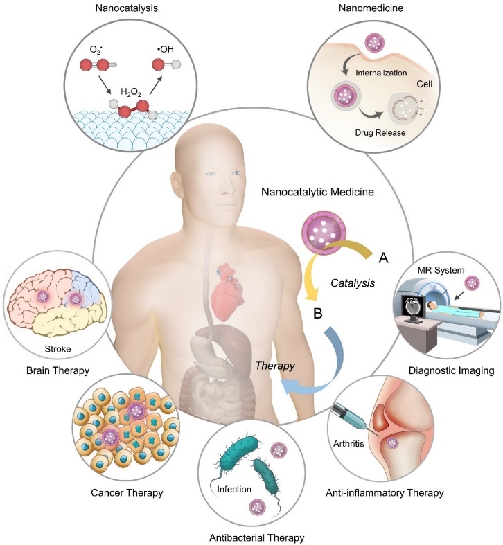 基于研究團隊前期提出的“納米催化醫學”創新理念,聚焦用于重大疾病診療的新型納米催化劑的可控制備與生物醫學應用,闡明其在內外環境激發下的催化化學反應用于疾病診療的相關分子機制,并優化其診療性能。在重點研究納米生物催化劑生物安全性的基礎上,努力推動其臨床轉化應用。