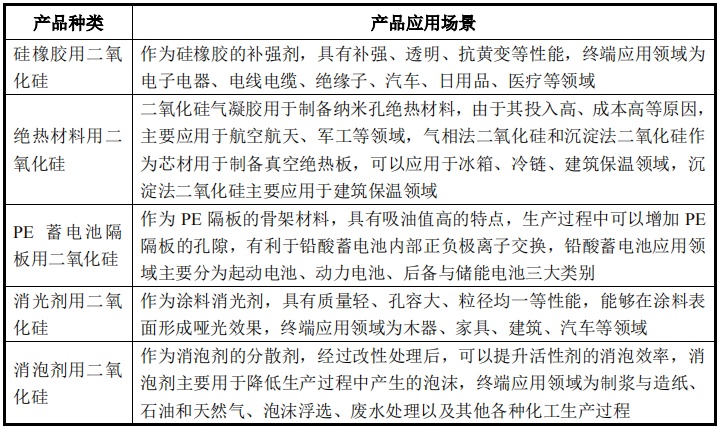 遠翔新材產品從應用領域來看,主要分為硅橡膠用、絕熱材料用、PE蓄電池隔板用、消光劑和消泡劑用二氧化硅,目前業務重心在硅橡膠用二氧化硅,下游可廣泛應用于電子、電線電纜、絕緣子、汽車、日用品、醫療等領域。遠翔新材部分產品也可應用于其他領域,如絕熱材料、PE蓄電池隔板、消光劑、消泡劑等。遠翔新材主要產品質量穩定、抗黃性好、透明度高,在國內硅橡膠用二氧化硅領域具有較高的品牌知名度。