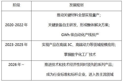2023-2025年計劃實現產品在高端3C、高端動力等領域規模應用;掌握數字化工廠技術。2026年以后推進技術和技術經濟性同時領先的系列產品;成為行業標準和標桿企業,進入各主流領域。