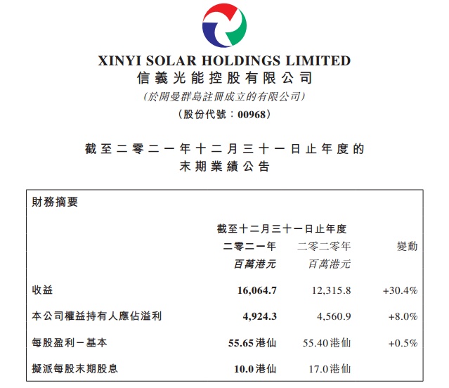 中國粉體網(wǎng)訊 2月28日,信義光能控股有限公司發(fā)布了2021年度業(yè)績(jī)公告。2021年,信義光能錄得收益16,064.7百萬港元,較2020年增加30.4%。信義光能權(quán)益持有人應(yīng)占溢利增加8.0%至4,924.3百萬港元。