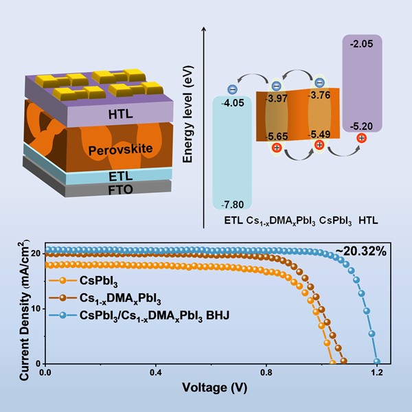 通過具有較大離子半徑的二甲胺(DMA+)或FA+替代無機鈣鈦礦中的部分銫離子,可以有效穩(wěn)定其鈣鈦礦相結構,同時降低其帶隙。但由于薄膜中依然存在大量缺陷,嚴重影響光生載流子的高效分離和傳輸。基于此,該中心提出在薄膜內部構建本體異質結的思路,通過縮短光生載流子在半導體層中停留時間來減小載流子的復合損失。但如何實現(xiàn)穩(wěn)定的鈣鈦礦與鈣鈦礦的異質結又是另一難題,因為傳統(tǒng)的有機-無機雜化鈣鈦礦材料中存在顯著的離子遷移,這種離子遷移會使鈣鈦礦成分趨向于均勻分布。而銫基鈣鈦礦較大的離子遷移勢壘滿足于構建體相異質結的先天條件。最終,科研人員通過中間相調控的策略,實現(xiàn)了n型導電的銫基鈣鈦礦摻雜相和p型導電的非摻雜相的穩(wěn)定本體異質結。