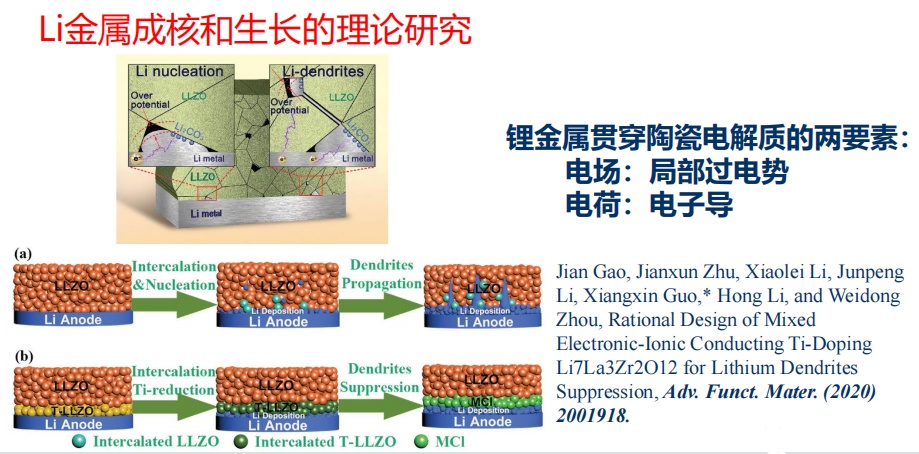 原來大家認為采用很硬的陶瓷,剛性很強,和鋰金屬搭配,可以抑制鋰枝晶。現在大家認為不但沒有抑制鋰枝晶,反而加速了鋰枝晶的生長。對其機理,目前研究的比較深入,我們也做了一些總結。整體而言,有兩個重要要素。