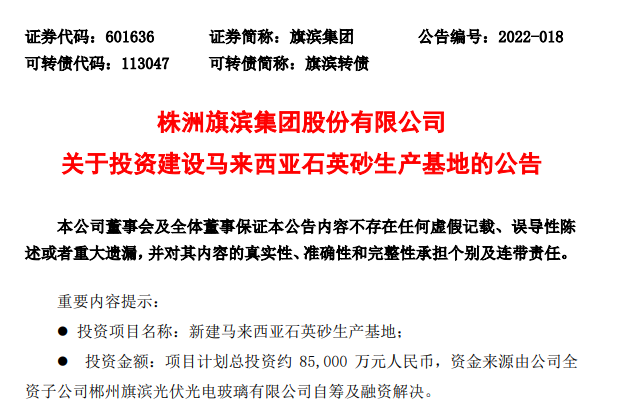公司本次在馬來西亞沙巴州建設石英砂生產基地,一是保證旗濱馬來西亞光伏玻璃生產線項目的用砂需求和穩定供應;二是降低對外購硅砂的依賴,大幅提高上游采購議價能力,有效控制和降低產品生產成本,提升產品質量;三是充分利用當地砂資源,布局海外光伏玻璃生產基地的硅砂資源戰略儲備,進一步增強集團國內光伏玻璃硅砂資源供應保障。