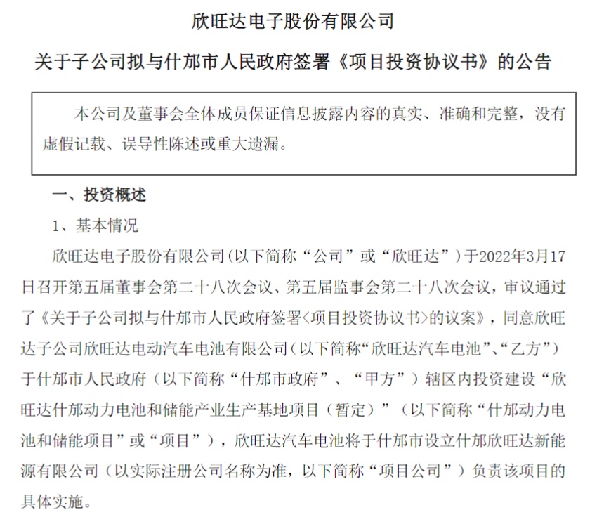公告顯示,欣旺達汽車電池將于什邡市設立什邡欣旺達新能源有限公司負責該項目的具體實施。項目內(nèi)容為新建動力電池及儲能電池電芯、模組、PACK、電池系統(tǒng)等生產(chǎn)基地。 項目計劃 2022 年實施,建設周期約12個月,具體以項目實施計劃為準。