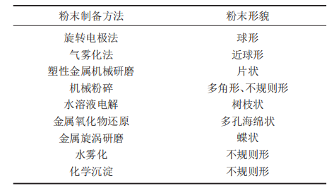 (3)粉末形貌:粉末形貌和粉末的制備方法密切相關,一般由金屬氣態或熔融液態轉變成粉末時,粉末顆粒形狀趨于球形;由固態狀變為粉末時,粉末顆粒多為不規則形狀;而由水溶液電解法制備的粉末多數呈樹枝狀。一般而言,球形度越高,粉末顆粒的流動性也越好。3D打印金屬粉末要求球形度在98%以上,這樣打印時鋪粉及送粉更容易進行。下表為不同制粉方法對應的金屬粉末形貌。