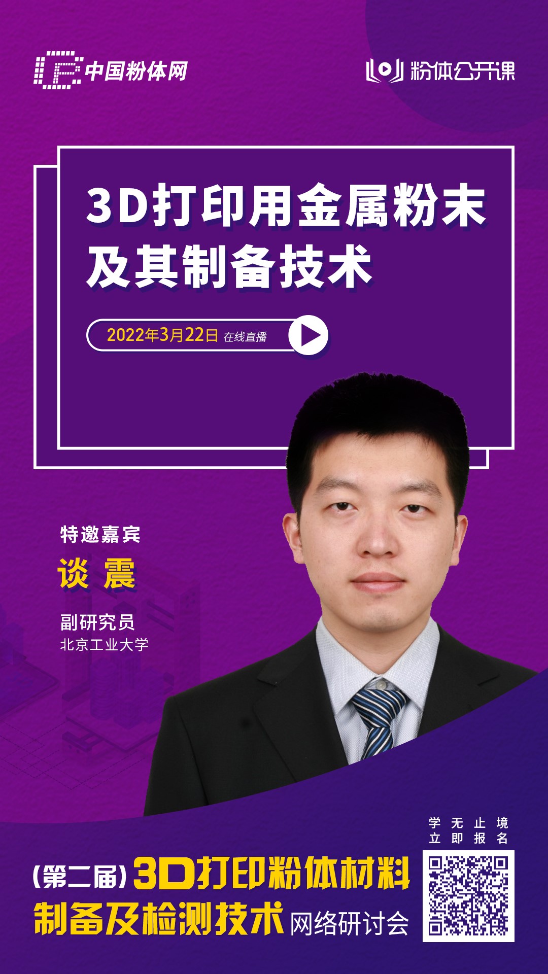 想更多了解3D用金屬粉末的主要應用領域、制備方法、不同金屬粉末特點及其發展方向,請關注“第二屆3D打印粉體材料制備及檢測技術網絡研討會”。此會議主辦方為中國粉體網旗下粉體公開課平臺,會議時間為2022年3月22日,屆時將邀請北京工業大學的談震副研究員作《3D打印用金屬粉末及其制備技術》的報告。報告將介紹3D打印技術的基本原理,并對3D打印用金屬粉末的特點、要求、主要制備方法及其應用領域進行詳細介紹,最后對3D打印用金屬粉末的發展方向進行展望。