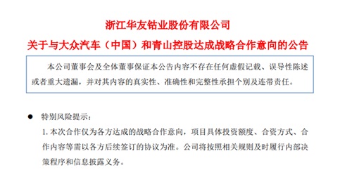 中國粉體網訊 3月22日,華友鈷業發布公告,浙江華友鈷業股份有限公司(以下簡稱“公司”或“華友鈷業”)與大眾汽車(中國)投資有限公司(簡稱“大眾汽車(中國)”)和青山控股集團有限公司(以下簡稱“青山控股”)就動力電池正極材料產業鏈上下游合作分別達成戰略合作意向,擬共同布局印尼鎳鈷資源開發,以及鎳鈷硫酸鹽精煉、前驅體加工和正極材料生產等動力電池正極材料一體化業務,旨在進一步強化動力電池原料供應保障,加強包含前驅體、正極材料等全產業鏈的技術創新協同,共同打造具有國際競爭力的新能源鋰電材料一體化制造平臺,增強公司在全球動力電池材料供應鏈中的核心競爭力。