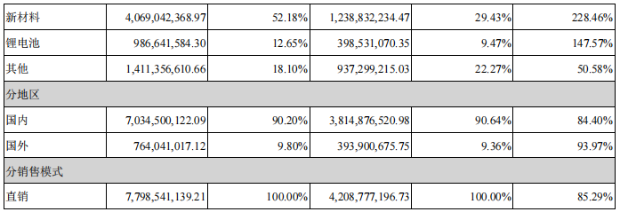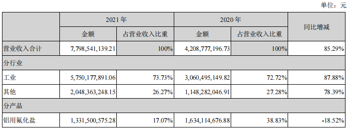 多氟多主要從事高性能無機氟化物、電子化學品、鋰離子電池及材料等領域的研發、生產和銷售。對于2021年度的業績暴增,多氟多表示,公司新材料業務板塊處于持續增長態勢,以六氟磷酸鋰為代表的新材料產品市場需求旺盛,銷售價格迎來新高;新建產能超預期釋放,產品供不應求。同時,通過技術更新迭代、提升原材料轉化率等多項措施,實現降本增效,保證了較強的盈利能力。