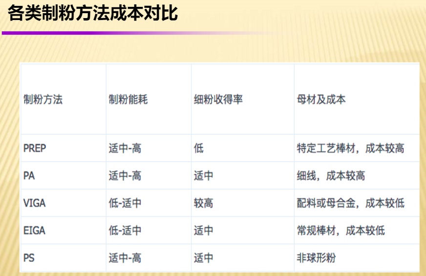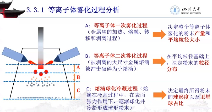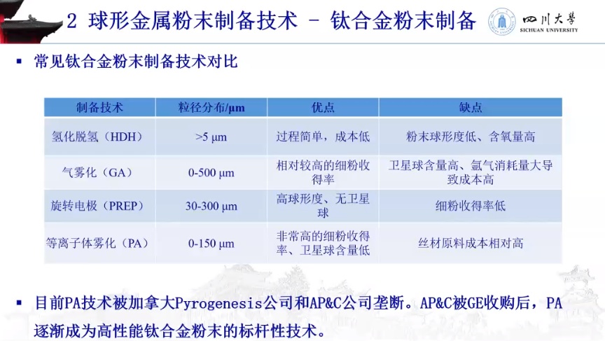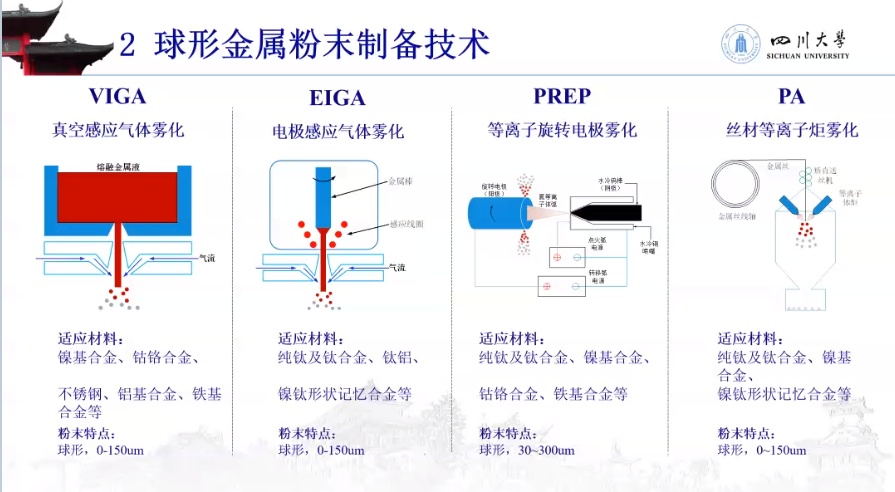 接下來,余德平教授以鈦合金粉末為例,詳細講解了球形金屬粉末的幾種制備技術(shù),主要包括真空感應(yīng)氣體霧化(VIGA)、電極感應(yīng)氣體霧化(EIGA)、等離子旋轉(zhuǎn)電極霧化(PREP)、絲材等離子炬霧化(PA)。
