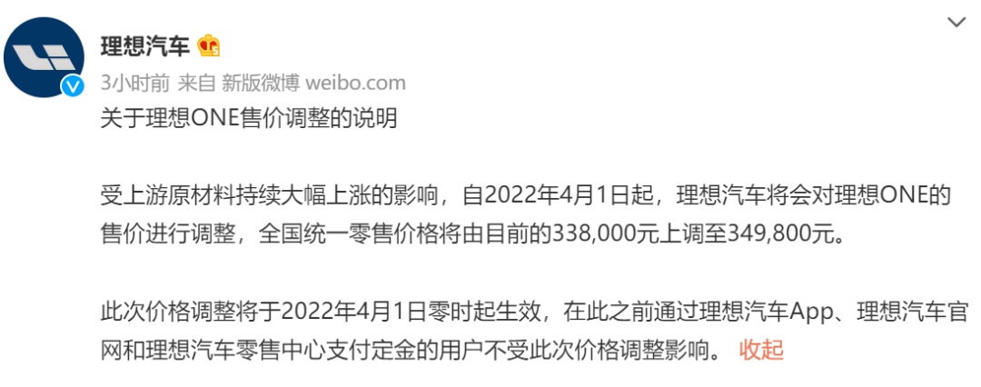 今天早上,理想汽車在官方微博發布關于理想ONE售價調整的說明稱,受上游原材料持續大幅上漲的影響,自2022年4月1日起,理想汽車將會對理想ONE的售價進行調整,全國統一零售價格將由目前的33.8萬元上調至34.98萬元。即理想ONE售價將上調1.18萬元。
