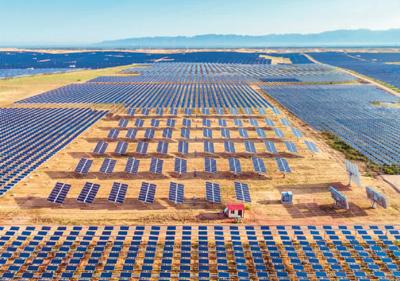 春日暖陽下,庫布其沙漠中的光伏“藍(lán)海”,與波浪般的綠意交相輝映,為這片土地增添了更多的生機(jī)與活力。