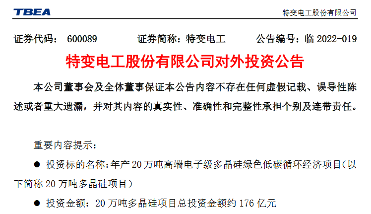 3月16日,特變電工發布公告稱,為抓住全球光伏產業快速發展機遇,進一步提高多晶硅產品的市場占有率,增強公司新能源產業的核心競爭力及盈利能力,公司控股子公司新特能源以其全資子公司新特硅基新材料有限公司為主體,在新疆昌吉準東產業園區投資建設年產20萬噸高端電子級多晶硅綠色低碳循環經濟項目。本項目總投資約176億元。