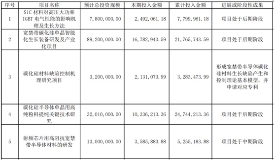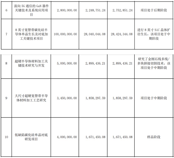 在研發方面,報告期內,公司堅持以技術與研發驅動為引領,推動產品成本與售價的持續降低,加快碳化硅材料在下游領域的迭代應用。2021年,公司持續加大研發投入,研發實力不斷增強,取得了豐碩的研發成果。2021年,公司研發費用7,373.61萬元,占營業收入的14.93%,研發費用同比增加了62.05%。依托“項目 B”、“8 英寸寬禁帶碳化硅半導體單晶生長及襯底加工關鍵技術項目”等研發項目,公司在加快研發大尺寸碳化硅襯底以及提升導電型襯底關鍵指標等方面獲得突破性進展。
