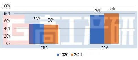 2020-2021年中國負極材料行業(yè)集中度(%)